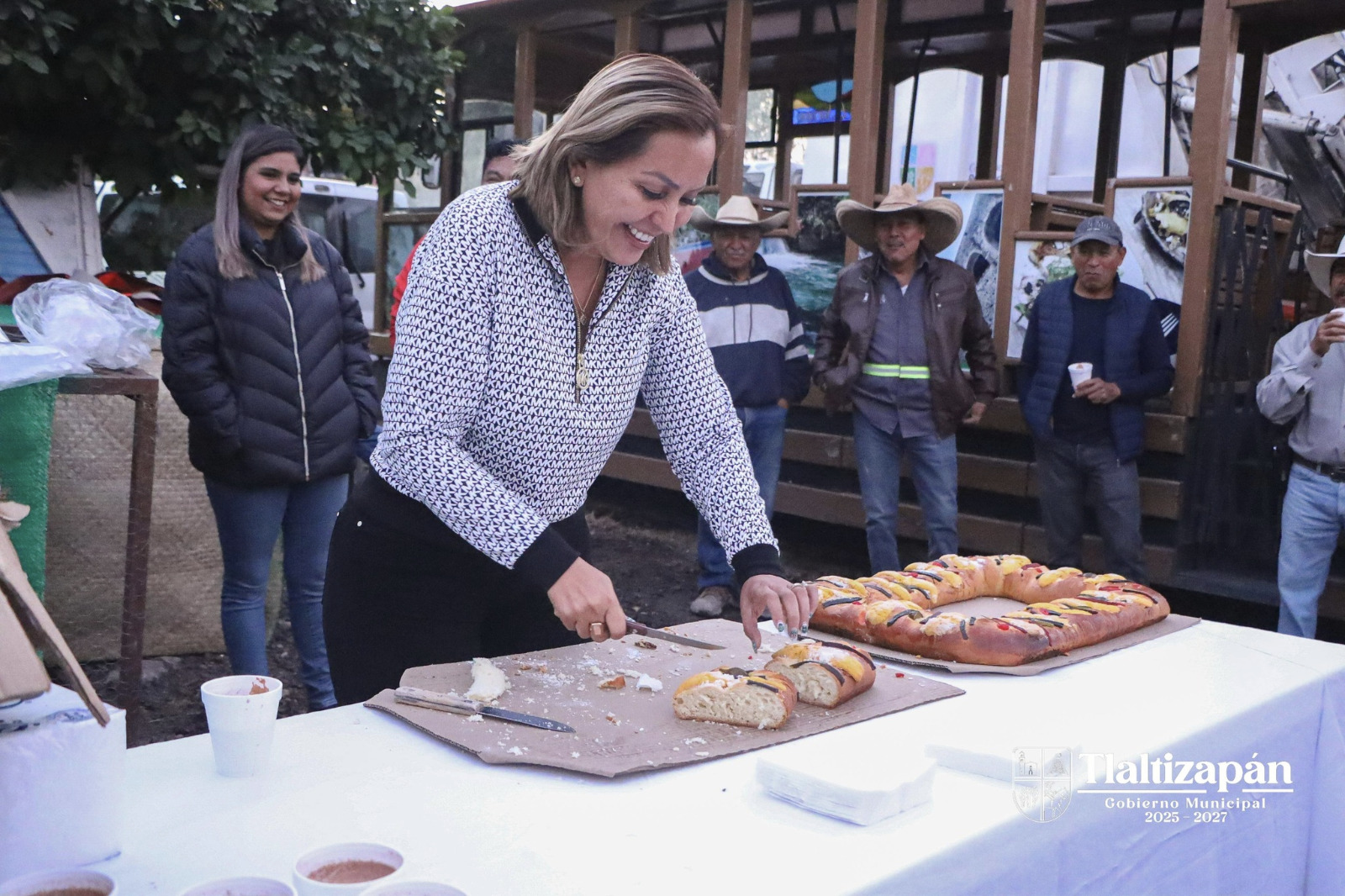En el inicio de las actividades administrativas del a帽o, la presidenta municipal de Tlaltizap谩n, Nancy G贸mez Flores, particip贸 en la partida de la tradicional Rosca de Reyes con personal de Servicios de Recolecci贸n, Seguridad P煤blica y 谩reas del H. Ayuntamiento.