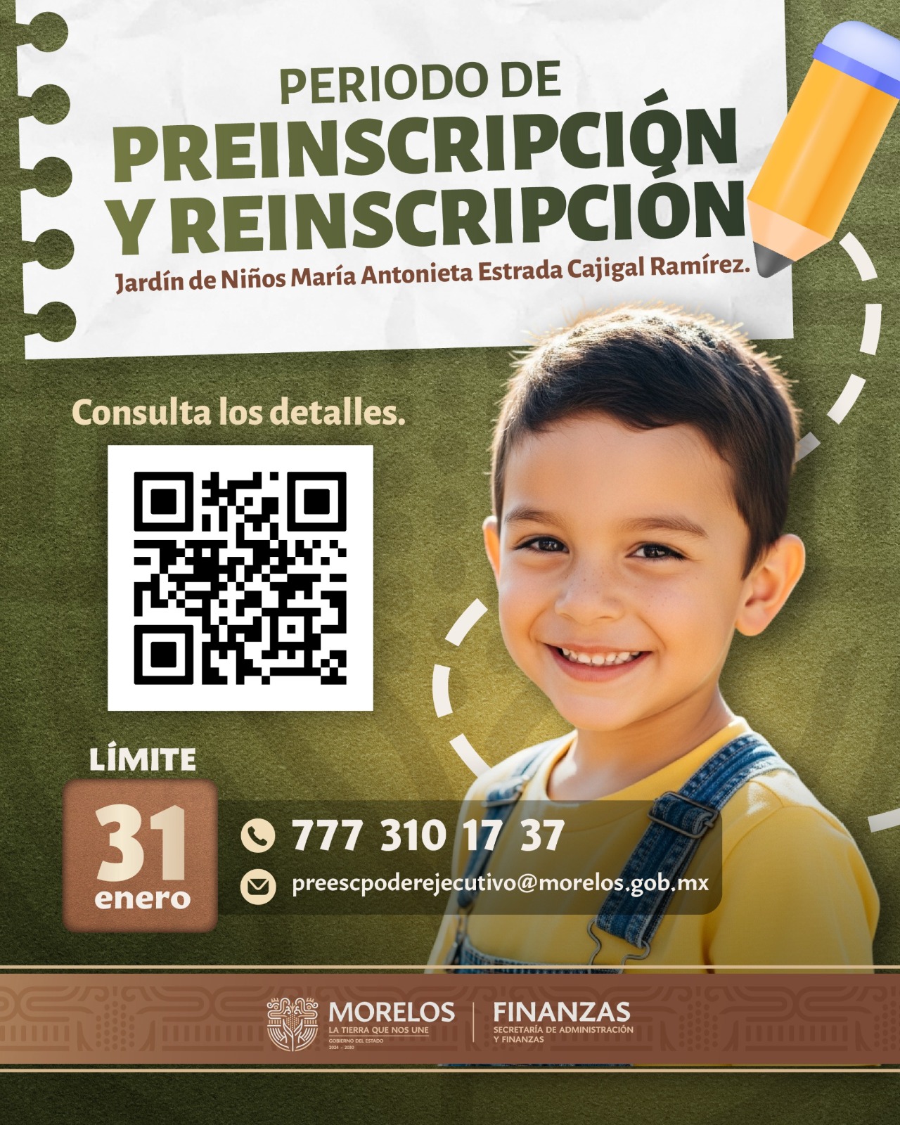 El Gobierno de Morelos convoca a los servidores públicos a inscribir a sus hijos en el Jardín de Niños “María Antonieta Estrada Cajigal Ramírez”. La Secretaría de Administración informó que el registro para el ciclo escolar 2026 está disponible para trabajadores de la administración central y organismos auxiliares, con fecha límite al 31 de enero.