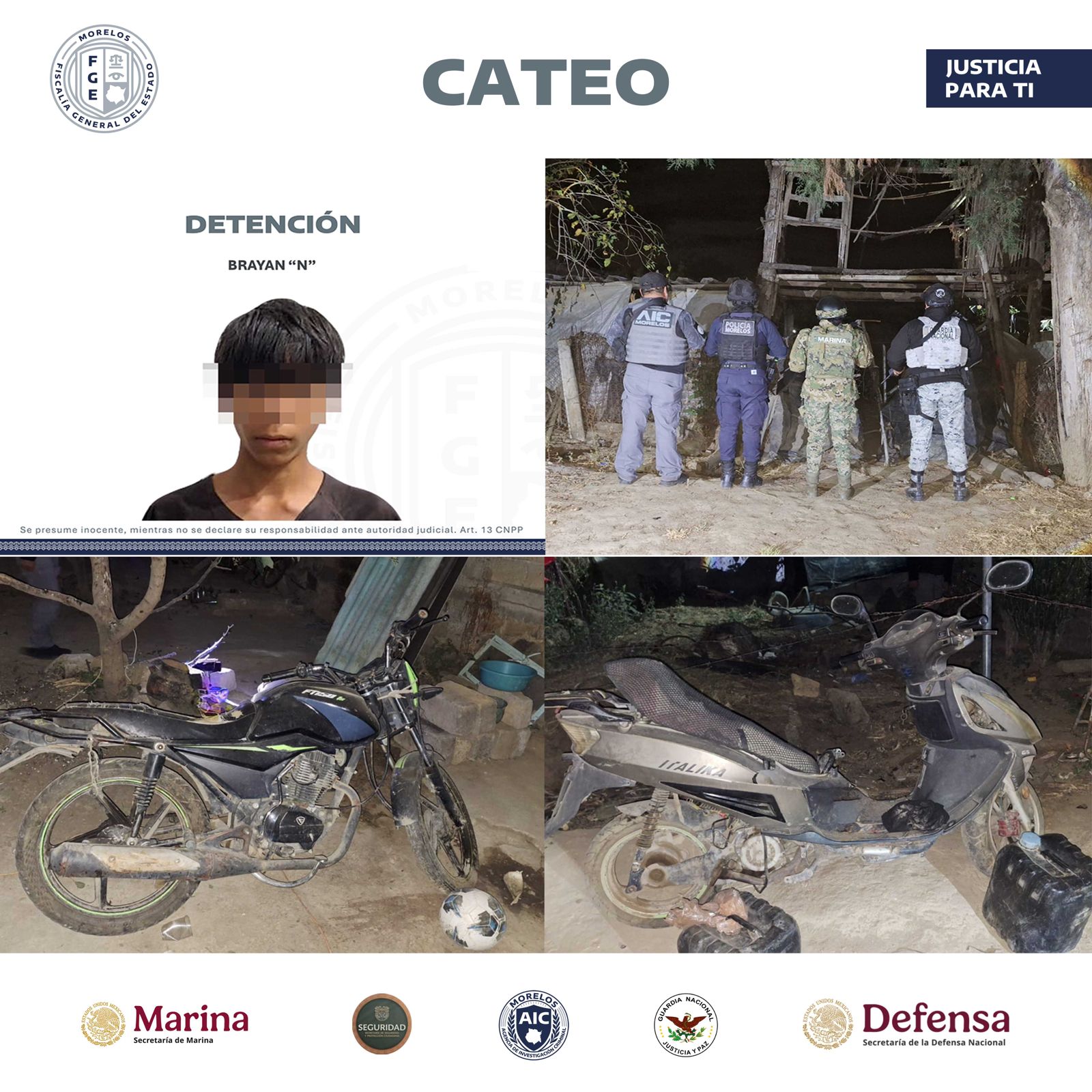 YECAPIXTLA, MOR. — Agentes de investigación criminal catearon un inmueble en Yecapixtla presuntamente utilizado para desvalijar motocicletas robadas. Durante el operativo en el poblado Los Capulines, autoridades detuvieron a Brayan “N”, de 18 años, y aseguraron dos unidades desmanteladas junto con una bolsa de marihuana. El implicado enfrentará cargos por robo de vehículo y delitos contra la salud.