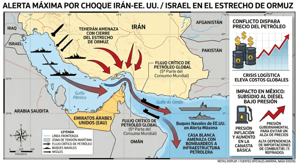 Para México, el impacto de este choque geopolítico es inmediato y de alto riesgo. El encarecimiento abrupto del barril de petróleo en los mercados internacionales ejerce una presión extraordinaria sobre las finanzas públicas del país. Al ser un importador neto de combustibles refinados, el Gobierno Federal se ve forzado a inyectar más recursos al subsidio del diésel y las gasolinas para contener los precios. Si el Estado no absorbe este sobrecosto internacional, el incremento se trasladará a la cadena de suministro, desatando una crisis de inflación que impactaría de lleno en el costo de los alimentos y bienes básicos de las familias mexicanas.