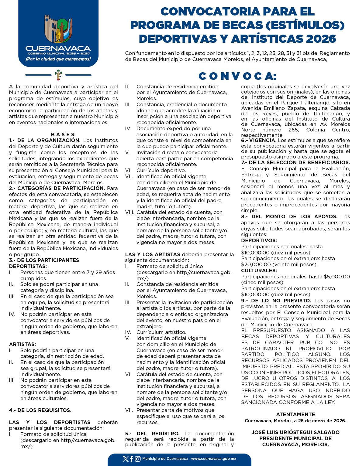 ¿Eres deportista o artista en Cuernavaca? El Ayuntamiento lanzó su Programa de Becas 2026 con apoyos económicos de hasta 20 mil pesos para competencias nacionales e internacionales. El registro ya está abierto y se cerrará en cuanto se agoten los recursos, ¡así que apresúrate a entregar tu documentación y asegurar tu estímulo!