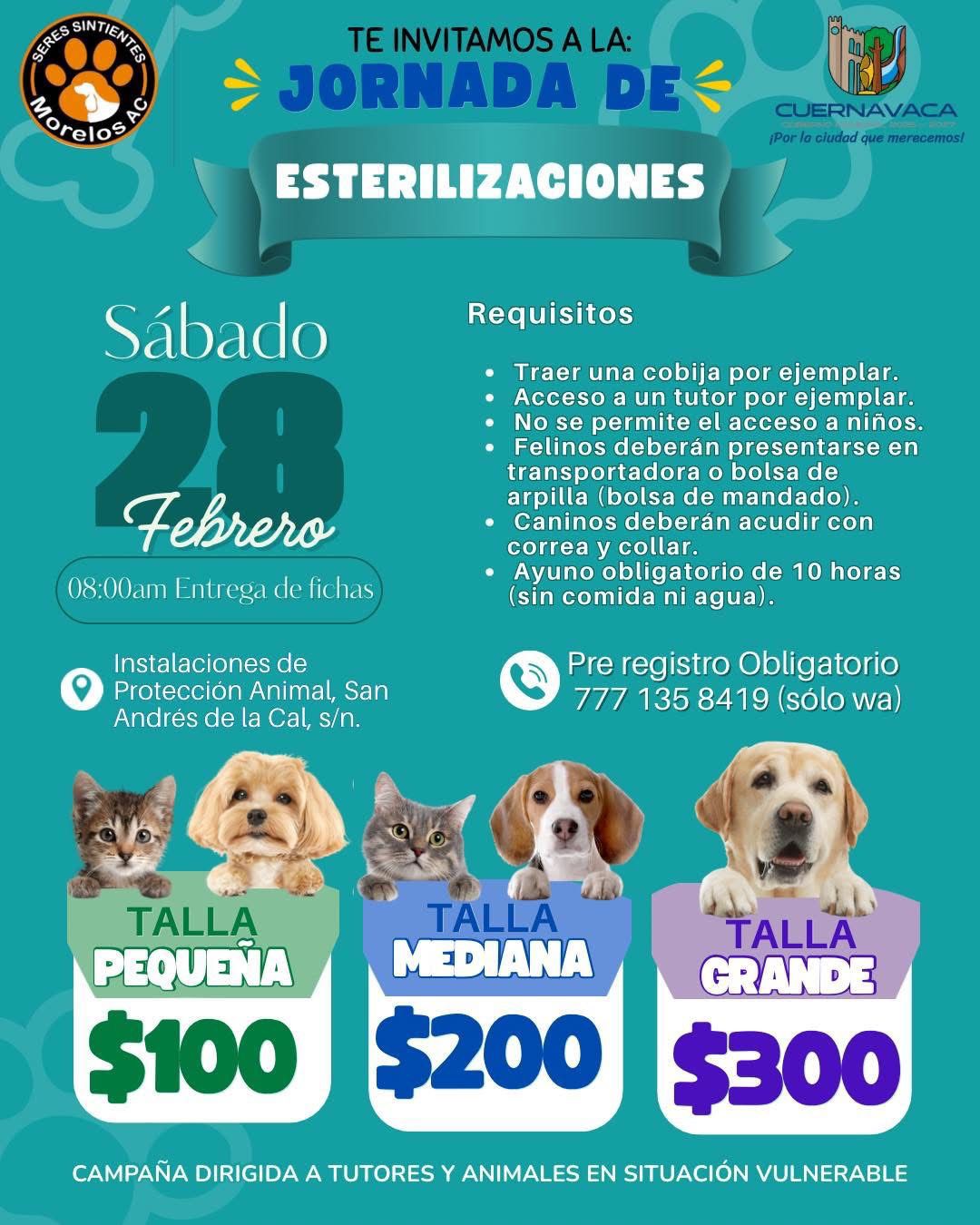 Requisitos básicos: Para ambos servicios, los animales deben tener más de tres meses de edad y estar en óptimas condiciones de salud. Los interesados pueden realizar un prerregistro o solicitar más información vía WhatsApp al 777 135 8419.
