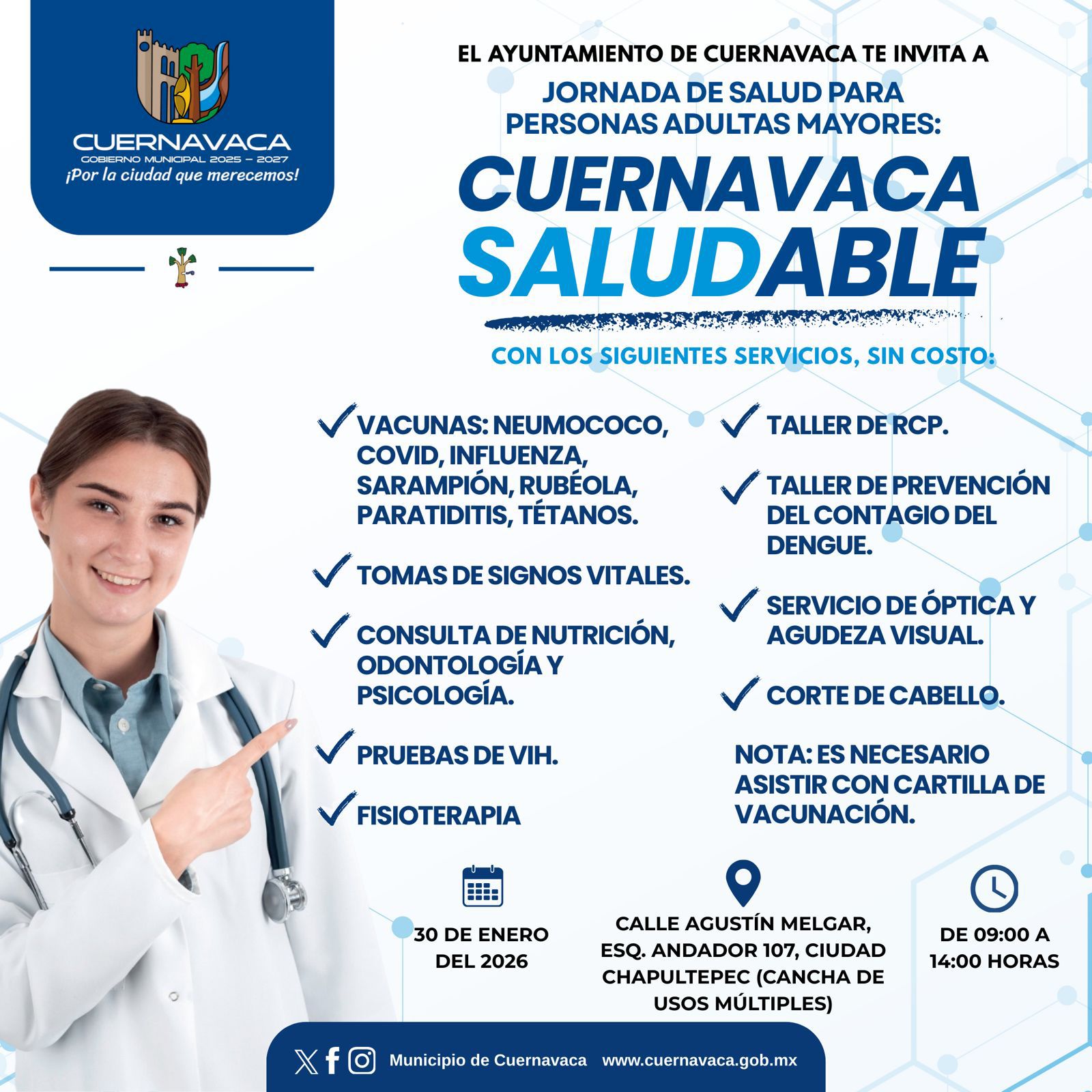 El Ayuntamiento de Cuernavaca invita a la jornada “Cuernavaca Saludable” este viernes 30 de enero en la colonia Ciudad Chapultepec. De 09:00 a 14:00 horas, las personas adultas mayores podrán acceder gratuitamente a vacunas, consultas médicas, fisioterapia y exámenes de detección, con el fin de promover el bienestar y la prevención integral en este sector.