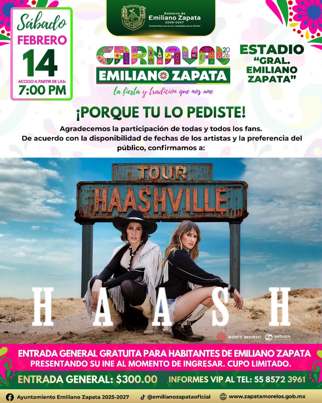 Este sábado 14 de febrero, en el Estadio “Gral. Emiliano Zapata”, disfrútalo como parte de la Feria de la Candelaria y Carnaval 2026, con el espectacular Tour Haashville. ¡Una noche llena de música, emoción y grandes éxitos de Ha-Ash!