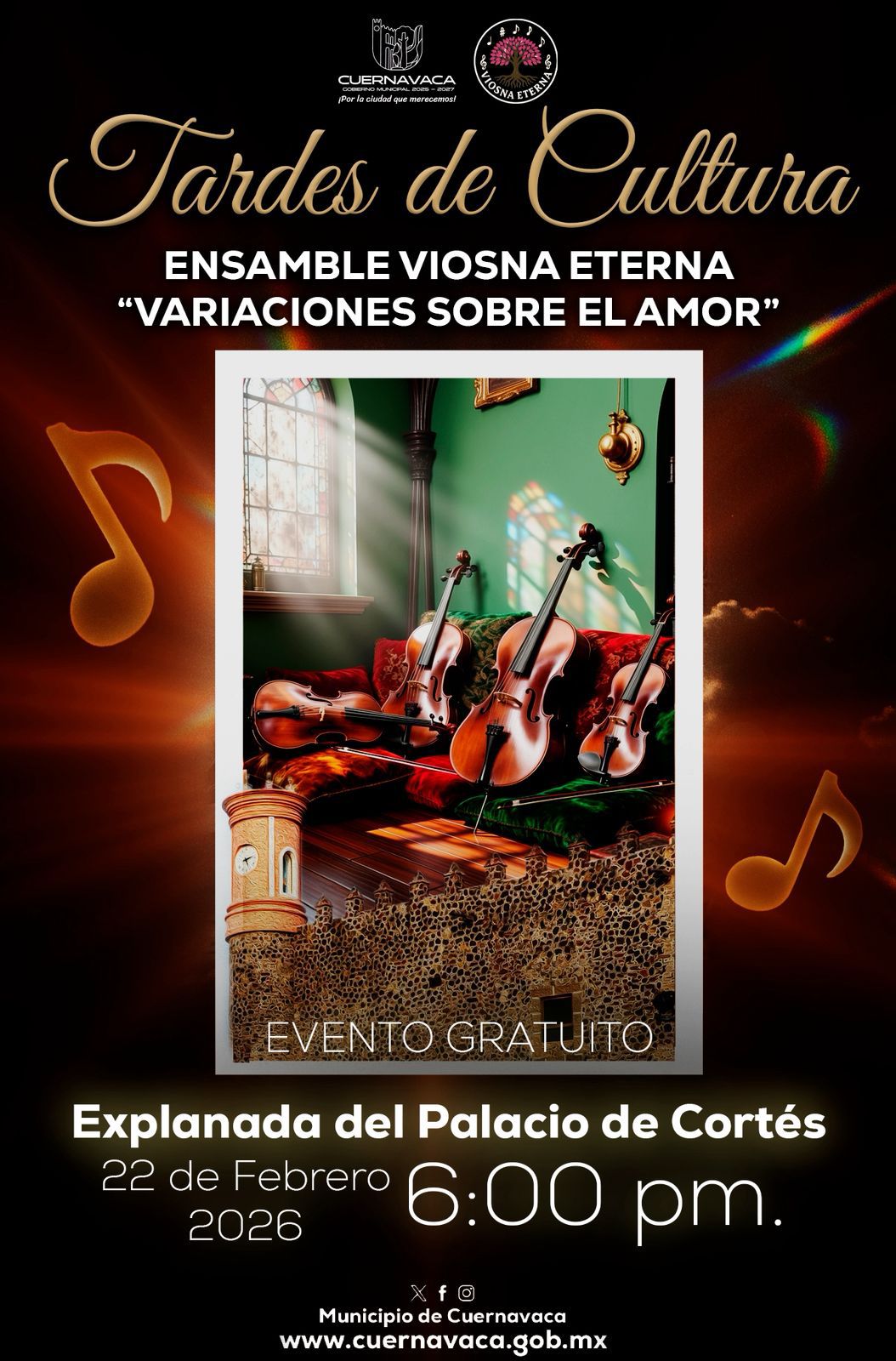 El Ayuntamiento de Cuernavaca te invita a disfrutar, junto con tu familia, de una tarde especial en el corazón de la ciudad con el concierto Ensamble Viosna Eterna “Variaciones sobre el amor”. ✨🎻